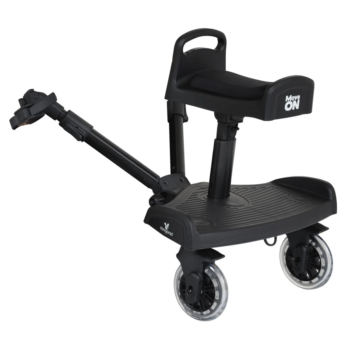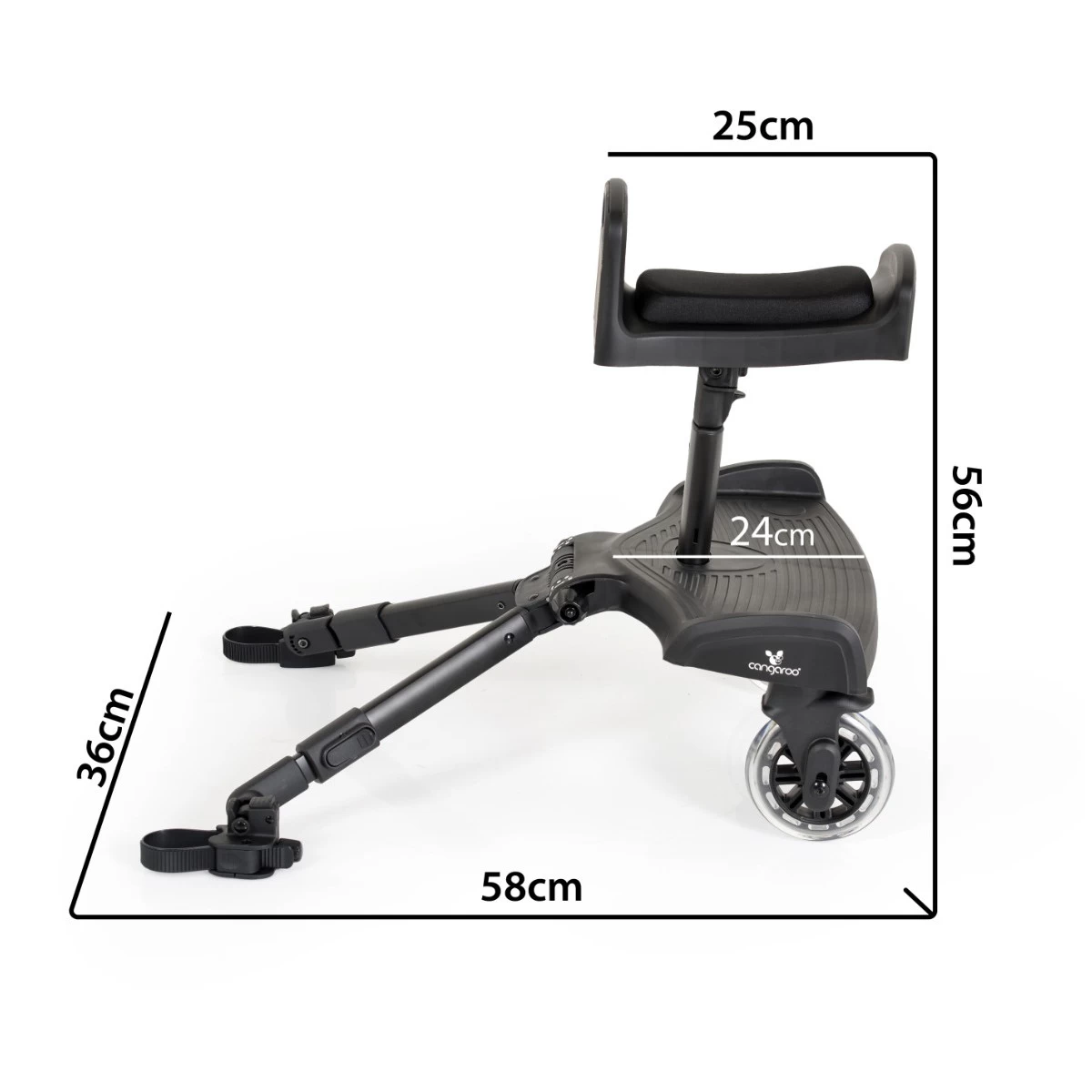 Gezellig met z’n allen op pad! Dit meerijdplankje van Cangaroo is superhandig als je met twee kleintjes op pad wil. De jongste kan lekker in de kinderwagen en de oudste kan op dit plankje staan of zitten met het bijgeleverde zitje.