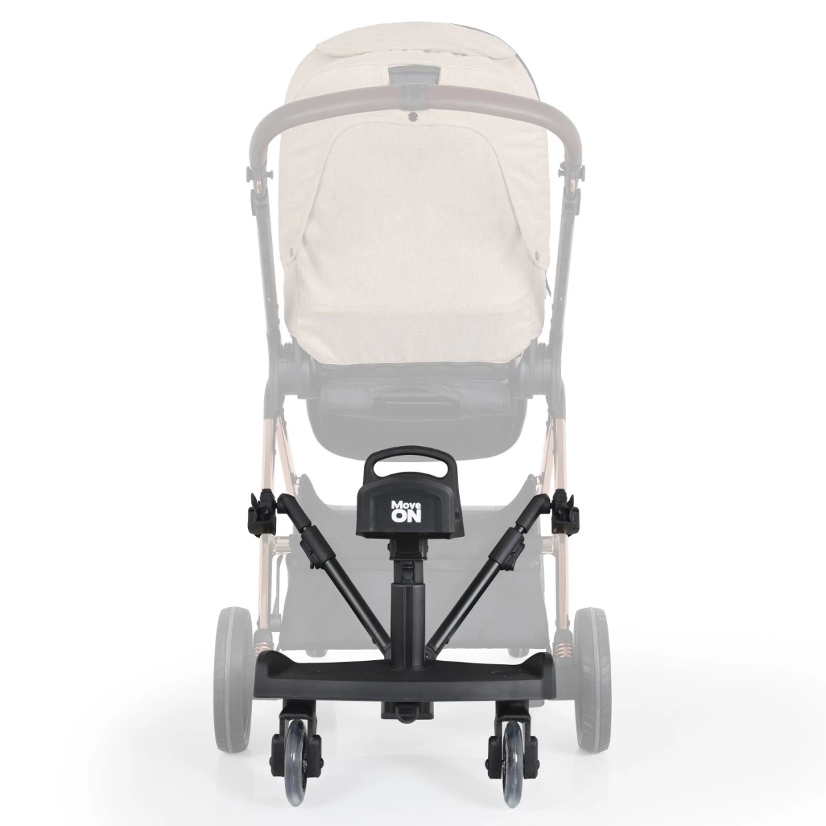 Dit meerijdplankje is universeel. Door de verstelbare bandjes waarmee je hem bevestigd, kan deze aan bijna elke kinderwagen bevestigd worden. Door de zwenkwieltjes blijft je wagen ook makkelijk te bewegen. Bij dit plankje wordt een zitje geleverd welke 90 graden draaibaar en verstelbaar is in 3 hoogtes. Zo kan je kindje altijd lekker zitten.
