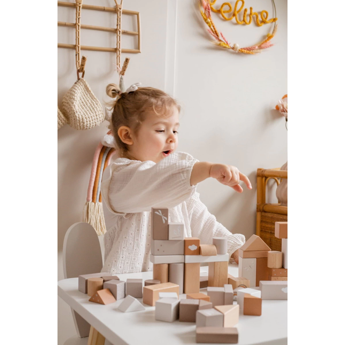 Wat een bouwplezier met deze blokkenset van Label Label! Je kindje raakt niet uitgespeeld, want de set bestaat uit maar liefst 50 stuks blokken! De toren kan meerdere manieren in elkaar gezet worden. De blokken hebben een mooie nougat kleur en zijn voorzien van verschillende figuurtjes.