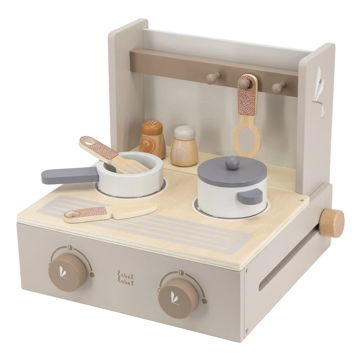Je kleine zal zich een ware chef voelen als hij/zij aan het koken is op dit houten kookstel van Label Label! Deze compacte set heeft 2 kookpitten met draaiknoppen om ze in te stellen. Daarnaast is de set uitgerust met een steelpannetje, pannetje, peper- en zoutstel, een mes, spatel en een opscheplepel.Â